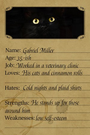 Gabe is a gentle soul. He loves animals and the hardest thing about being in the witness protection program is that he had to leave his two cats. He can endure the cold cabin and the bearded guys in plaid shirts staring at him as if he’s an alien when he goes into town, but to never see Toffee and Caramel again, Gabe can’t accept that.